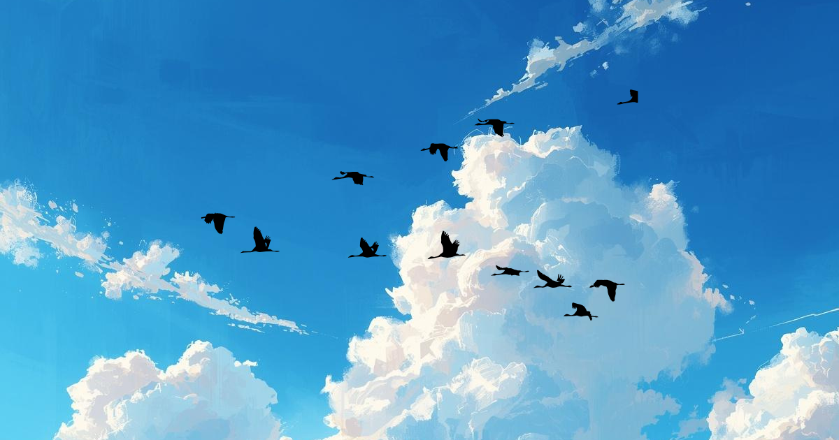 ふと目を上げると、数羽の鳥たちが空を舞っていた。 その動きは、まるで1ミリの狂いもないシンクロナイズドスイミングのようだ。規則正しく、優雅に、空という名の青い海を 右へ 左へと泳いでいる。